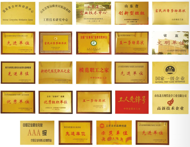 公司曾被国务院授予首批国家一级企业,“山泉”商标为省著名商标,被评为高新技术企业,是中国胶粘剂协会副理事长单位,山东复合材料学会常务理事单位,中国聚氨酯工业协会理事单位。