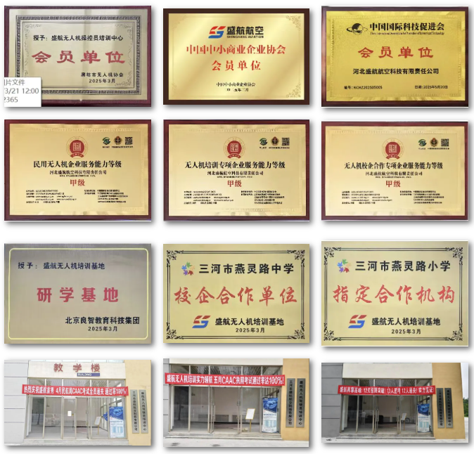 凭借在专业领域的突出贡献和企业硬实力,盛航航空荣膺“无人机培训专项企业服务能力甲级”“民用无人机企业服务能力甲级”等多项权威认证,并加入了廊坊市无人机协会、中国中小商业企业协会、中国国际科技促进会等重量级行业协会,积极参与行业生态共建。